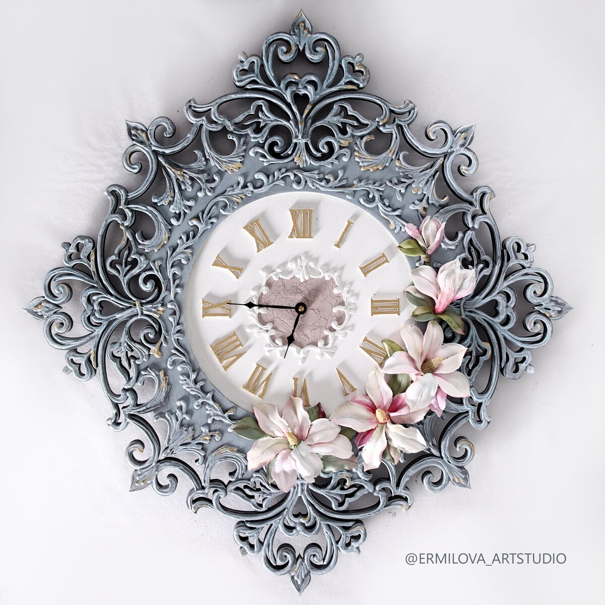 The consistency in teaching gives the excellent result that our students receive after completing the course. We can guarantee that even if you do not know how to draw, you will be able to make 5 panels with volumetric flowers from decorative plaster and 1 wall clock at the end of the course.